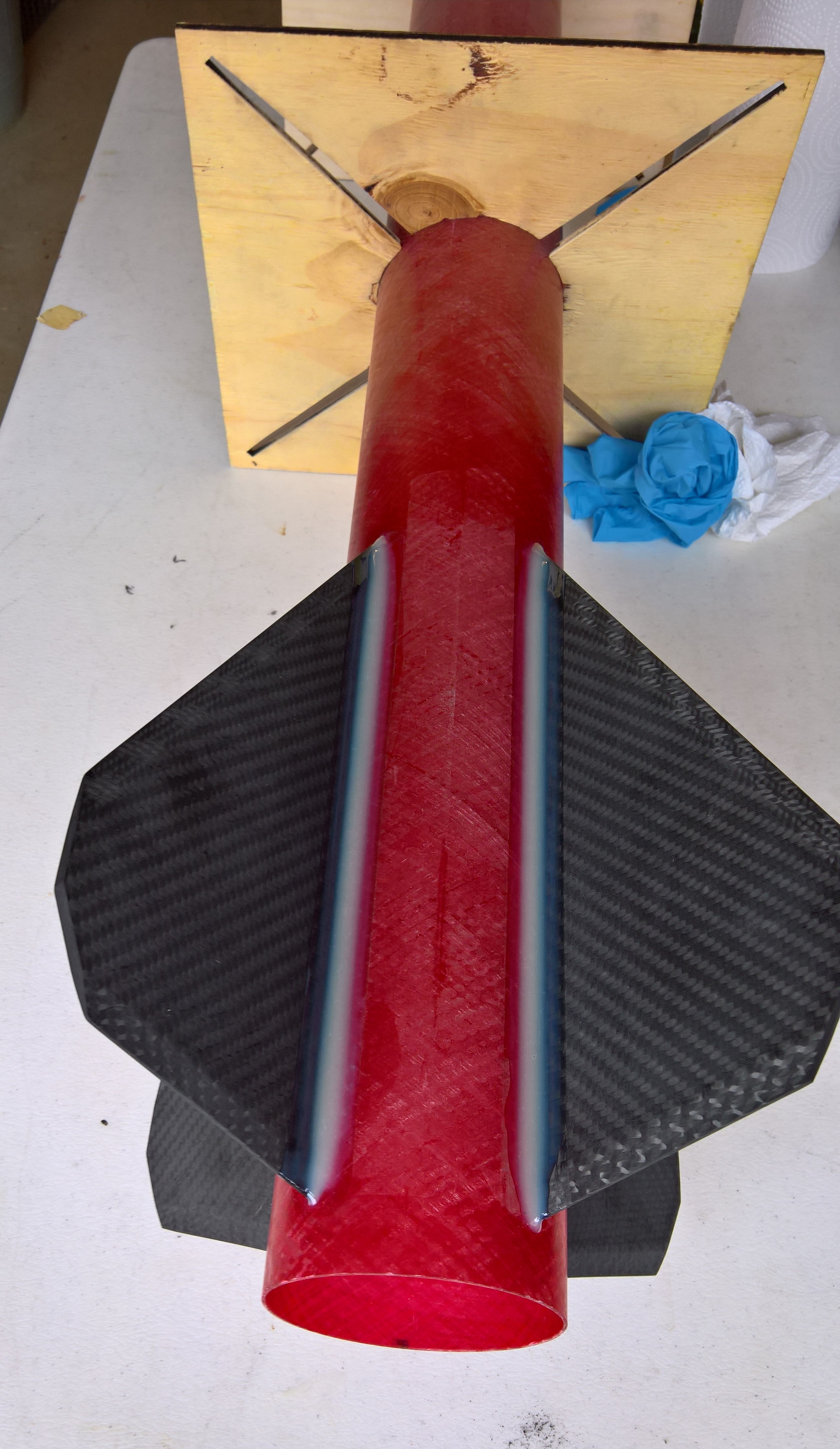 The purpose of this build is to give me another 4 inch diameter rocket to bring to a launch that can burn 75-98mm motors. I decided to make a few tweaks relative to the previous Punisher Style build. The changes being slightly smaller fins made of solid carbon fiber with the fins being moved up the body tube another 1/2 inch or so. The fins on the blue rocket have picked up a few knicks from hard landings hence the changes. The new fins will be cut from 0.200" twill weave carbon plate made by RockWest Composites.