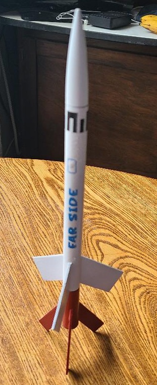 Far Side is a skill level 2 kit featuring two-stage mini motor rocket flights. It can be flown with the upper stage only. Featuring laser cut balsa fins. Plastic nose cone. High visibility mylar steamer, and waterslide decals.