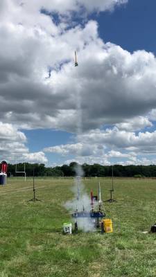Slight windcock to the left off the rod. Staged around the 211' mark and the sustainer continued to 919'. Long recovery drift on parawad chute but still recovered deep in the soccer field.