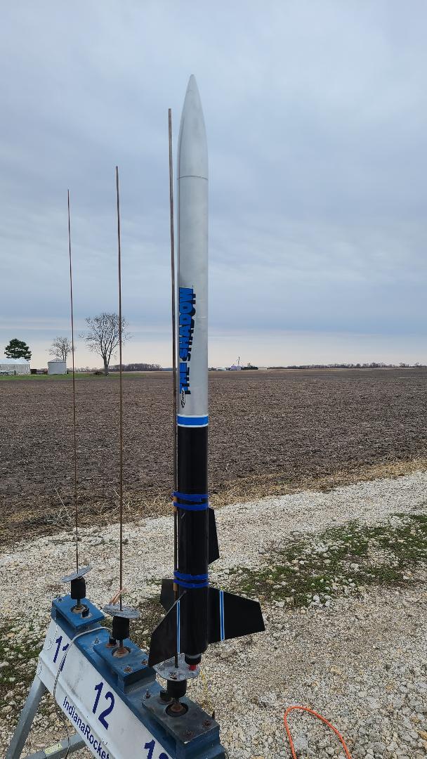 Took 5 tried to get the motor to light. Finally got a chuff and then away it went. Nice straight flight but parachute shrouds ended up wrapped around the body tube. No damage though. The delay was about 2-3 seconds too long but I didn't have an E20-4. No zipper though.