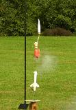 This is the standard Estes Bullpup 12D kit, modified with a small payload bay between the forward fins and the nose cone, and a engine mount pulled slightly rearward to allow for a metal spring-clip for the motor. It is internally modified with a Kevlar shock cord mount and a much longer shock cord.