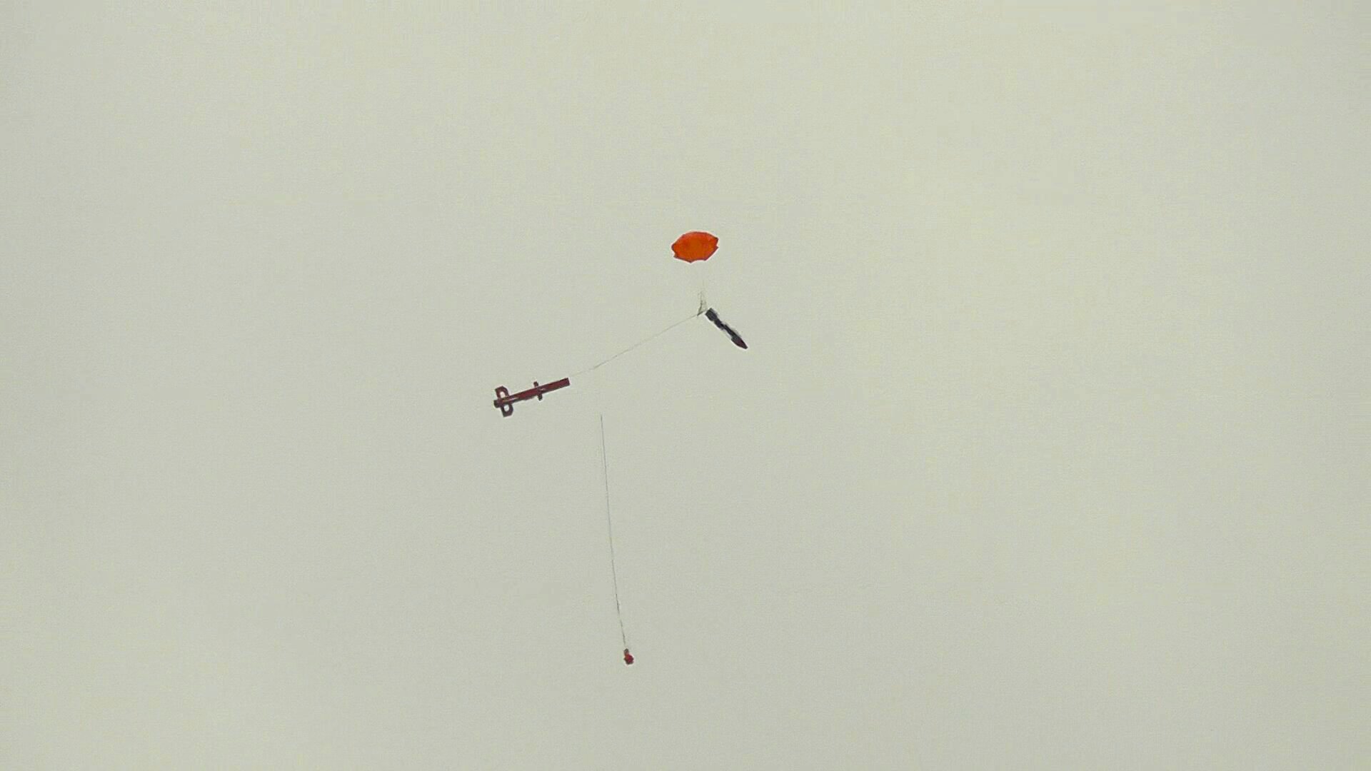 With its additional weight, it now is carried by two parachutes: a 19" and a 9" Nylon parachute. (The 9" is only for a redundant backup chute.)