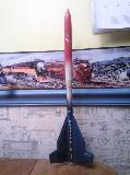 My first scratch build, built from the Estes Designer Special box around 1990. A small single stage payload rocket using a two-stage fin pattern from the set. Since each fin is one-piece (it didn't occur to me to make separate parts and glue them together), the grain on the tips isn't favorable. So, I glued 1/16th" balsa stringers to the fins to act as spars and covered them with Monocote. The launch lug is set into one of the fin's covering.