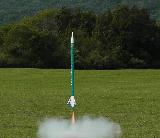 This tall kit is originally supplied with a single long body tube. Since it was damaged in shipping, I cut out the crushed section and spliced together two smaller tubes by making a long, 10" payload section out of the upper third. These tubes had to be sized exactly as the original, because the supplied full-body wrap decals needed to be used. This kit came with a lot of high quality parts, including a foil-lined motor tube, a parachute swivel, cloth-covered shock cord, matching aqua-colored heavy plastic parachute and of course all those decals. It takes 24mm D and E engines. I added an ejection baffle to this rocket.
