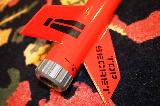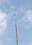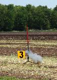 My modified Estes Mean Machine. Built with 3 fins, extended to 88" long, with a 29mm motor mount using an Estes plastic motor retainer. Split two-piece recovery, with a baffle as a mid-tube coupler. The nose is under a 12" parachute, and the lower section under a Red Max skull/crossbones 18" chute. Painted red & black inspired by the Der Red Max, using a combination of Red Max and Mean Machine decals.