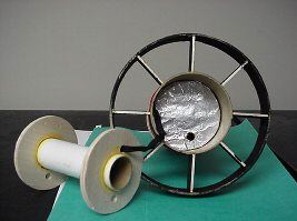 The shoelace is attached to the motor tube assembly. The aluminum foil-covered disk in the picture below is to protect the shockcord and upper portion of the barrel's insides. Since this is a rear ejection model the whole motor assembly should fit loosely in the body tube. The parachute is wrapped around the motor tube ( like in the Estes Sizzler). Care should be taken when test fitting the assembly so that holes can be drilled to allow the launch rod to pass through the rocket.
