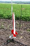 After building a clone, I decided an upscale was in order. The nose cone and decals came courtesy of Sandman. The rest was modeled in Rocksim to make sure it would all work together. The wings/fins are 3/16" light ply, and the rudders and tip winglets are finger tabbed together (like a drawer) to improve the joint strength. The dorsal raceway is 3/16" basswood, and the "faux" engine pod is a #200 tube on a tabbed 3/16" ply pylon. It has a 29mm mount and uses an Estes screw-on motor retainer. Recovery is 3/8" flat elastic on a kevlar leader, with a 30" Topflight parachute.