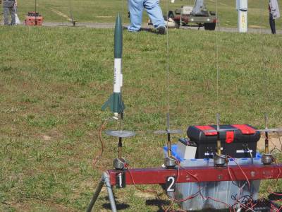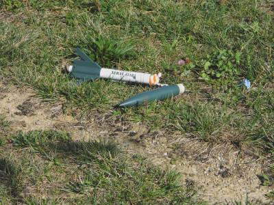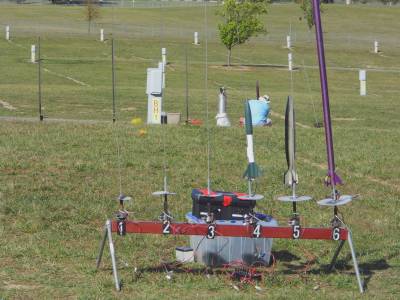 After recovering rocket I took it back to the car and removed the melted parachute. I then had to repair the shock cord as well as it was melted in three spots. After making repairs to the shock cord and replacing the parachute I loaded it back up, this time making sure I added the dog barf. For 2nd flight I opted to go with designed motor and loaded it up with a D12-5. This time it ripped off the pad and almost disappeared in the sky. I think I saw the chute deploy at apogee but hard to tell. Rocket drifted way, way, way down field in spite of the 4" spill hole that I had cut in the parachute. Hitched a ride with the mule driver to retrieve it. Found the rocket near the pond at the other end of the campgrounds. Recovery showed a couple of paint chips to 2 fins and a couple of tiny scratches in the NC.