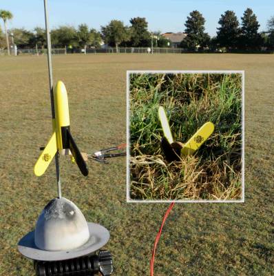 With the clear skies I was able to follow the entire flight. At ejection I thought I was following the ejected engine but it was the rocket. It nosed in and dug itself into the soft grass.