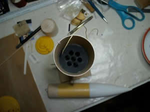 The motor mount was built and installed in the shortened body tube as per the instructions (LJ01). The yellow tube was modified into a payload section by use of a balsa nose block from Balsa machining. I formed a "eye hook" from a paperclip and ran it through the balsa block and bent the ends over inside the payload bay so that it couldn't come out(LJ02). I used a spare BT20 tube cut to 3" long and two BT60 to BT 20 centering rings to make a holder for a PerfectFlite ALK15 Altimeter.