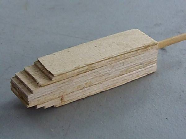 Now the real fun begins. First I grabbed a 1/4" dowel rod from my stock pile and measure and cut a 5" piece. After sticking it in my drill to verify that it didn't wobble I then started digging through my discarded balsa looking for 5"x1 1/4" pieces of various thickness to glue together to make a block. The first 5 layers I cut a 1/4"x 3" channel in the middle to make sure it centers on the dowel. After drying in clamps for a while I glued the dowel rod in and set it aside to dry for a while.