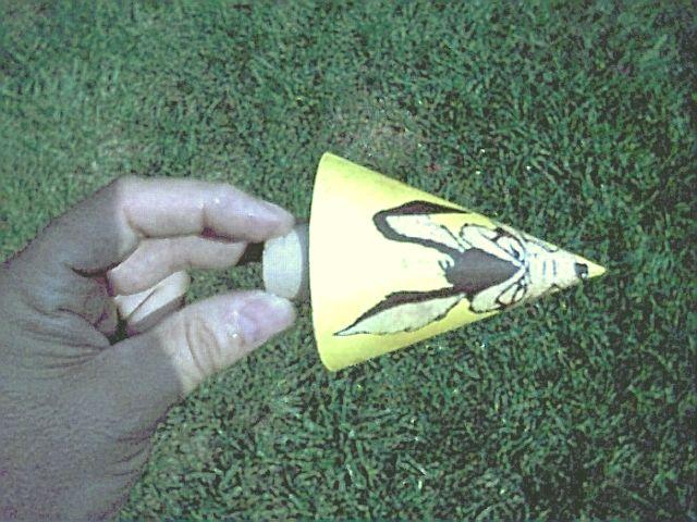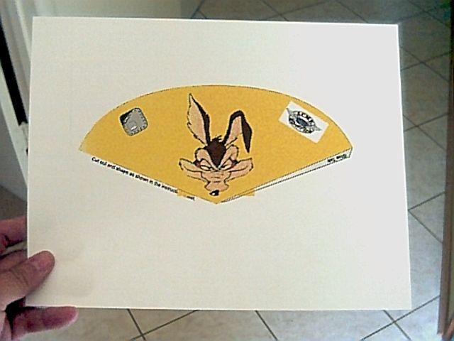 I decided to make my own nose cone shroud with Wile E. Coyote on it. Since blank skin templates weren't yet available, I scanned the template from the kit. I had found a front view of Wile E on the net, but knew he wouldn't look right if he was simply pasted onto the shroud. Therefore, I used a distortion filter in Adobe Photo Deluxe to wrap Wile E over a sphere. Thus, when the cone is formed, he was more-or-less straightened back out. I "borrowed" a few bits of graphics from FlisKits to complete my shroud, which I printed directly onto cardstock.