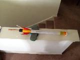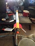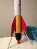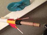 made from a thick sided tube. nose cone is a half ball door stop. motor mount made from a mouth wash cap & bottle. fins with stilts. motor mount mod on out side to fit boosters. with luck I mit see this Rocket again.