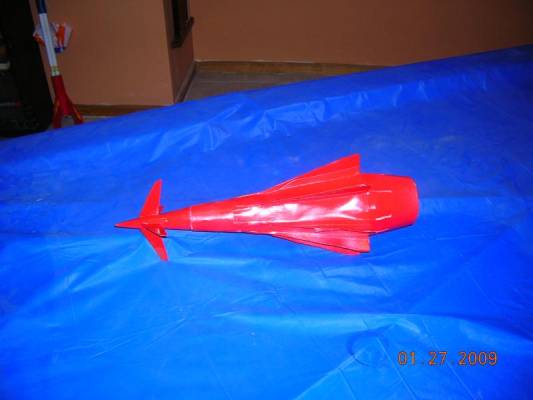This was 1st flight for my Futuristic rocket, EXT. Very calm day on Mountain Lake. Used a C6-3 but, don't know if a rebuild w/larger motor will help. Very unstable.