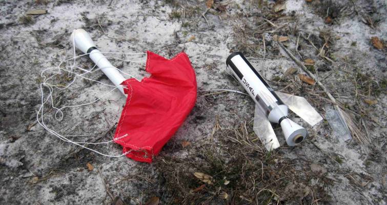 At 50' feet up, it did a full loop, then vertical again. Turned over at apogee an ejected full 'chute. One clear fin shapped in half, away from root edge.
