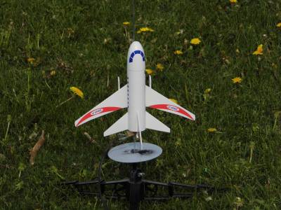In all fairness what happened next was not all the fault of the rocket. Instead of launching from my Estes pad I stuck the rod in my Mantis Launch Pad but did not have my usual clothes pin clip to secure it in the pad. When the rocket lit it hung just enough on the rod to pull it up out of the mount causing it to fall over. All of this motion happened in the blink of an eye with the end result being that the rocket arched over and flew horizontal to the ground at an altitude of about 30'.