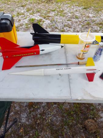 Good up. General agreement was that descent was fast on this Nite Flite. Lights stayed on throughout launch and landing. Beefed up battery holder on NC is a success. Rough landing with chute deployed. Who knows? It was dark. 2 fins loosened and repaired. - +E30-4 - Tampa Bay Rocketry Association [More]