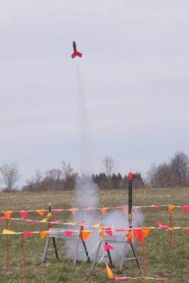 Another epic flight, this time on a black powder D12. Incredible height. Angling the rod slightly with the wind worked out well, with a straight, very high flight and a landing within arm's length of the pad. (The only flight pf the day to land so close.) This overachieving rocket always delivers even greater flights than I have come to expect from it.