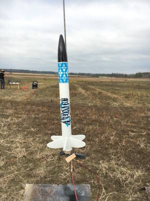 Awesome flight, fast, straight and high off the rod, arcing over at the top of the climb, nose up, still climbing a bit at ejection. Good chute, medium walk, sod landing, no damage.