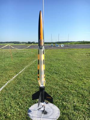 Almost 10 years between flights, still flies great! Nice smooth, straight boost, arcing over during the coast, nose down at ejection. Good blade deployment and spin-up. Nice gentle descent, started rocking side to side a bit as it got lower. Asphalt landing, no damage.