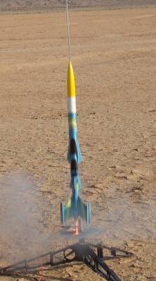 Great boost, quick and straight. Stalling out, still nose up at ejection. Chute and shock cord got tangled a bit and chute did not fully deploy. Quick descent, caught it on the fly. No damage.