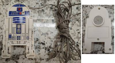 The oddest feature of the R2D2 launch controller is on the back: a stubby cylindrical projection with many holes in it. It seems that the designers planned to include an audible continuity alert - maybe even "droid sounds" - but abandoned it. Opening the controller, the speaker / sounder well was covered with a glued-in cap with a hole likely intended for lead wires. Opposite this speaker well is a small circuit board holding the LED and resistor and the contacts for the safety key. The launch button is a section of R2's body - a spring-loaded plastic section that makes contact with a momentary pushbutton switch on the circuit board. The cap glued into the speaker well has a small knob that supports the circuit board under the pushbutton switch, ensuring secure contact. For such a simple item, I was impressed with the engineering details.