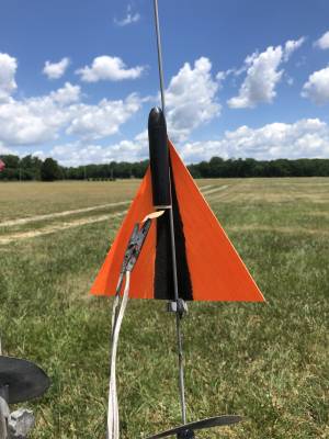 Impressive altitude with a windcock to the left. Fluttered rather than glided after ejection. Ejection charge broke the pod away from the glider and was lost. Glider body recovered out near the soccer goals.