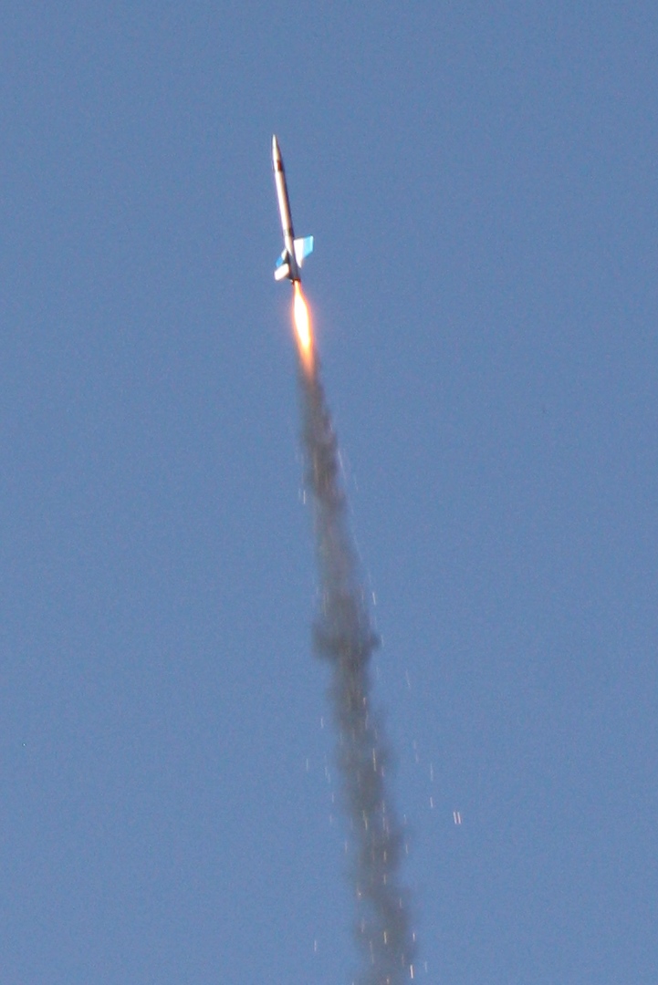This upscale of an Estes Orbital Interceptor is built with LOC 2.6" tubing and an Aerotech nose cone. Fins are 3/16" ply, with the exception of the tail plane (which is 1/8" ply). The tail plane is gussetted with triangular balsa stock and tabbed onto the rudder. Motor mount is 29mm, and can accept a 6-grain case. This model can handle full-H motors reasonably, but a small I would be the limit. Vinyl decals from Stickershock23.