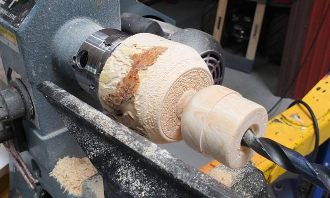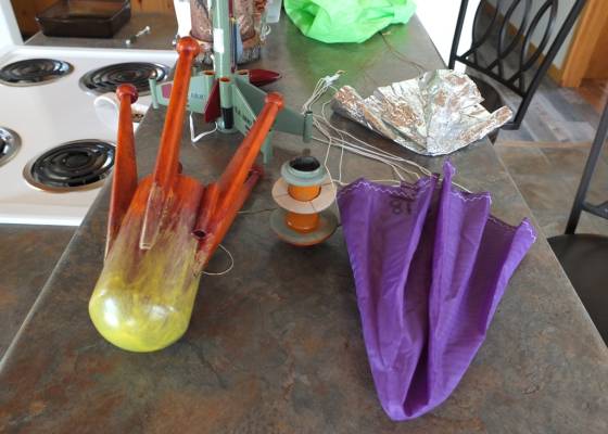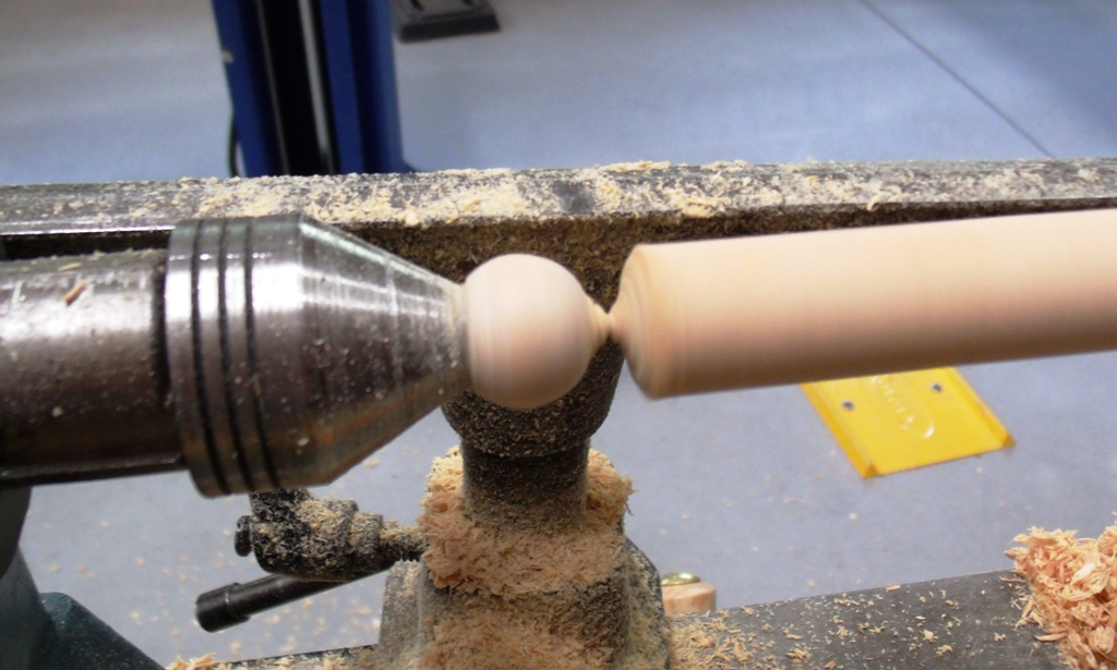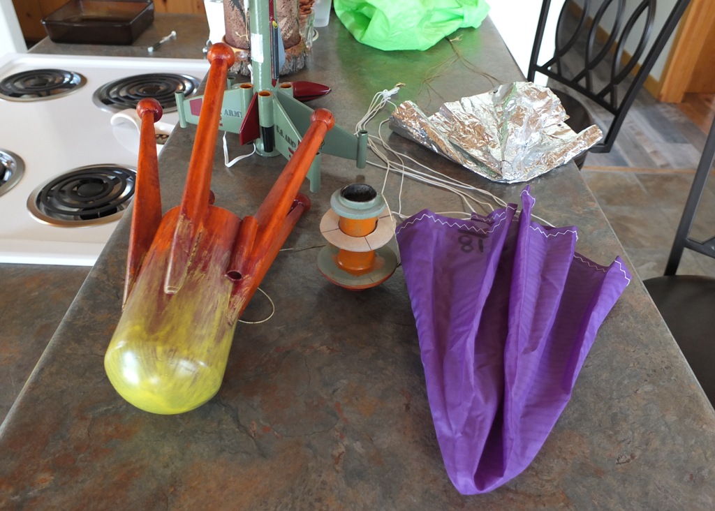 The nose cone I turned on my wood lathe from a piece of pinyon pine from our own property.