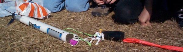 Single-stage, wide-body rocket for carrying small GI-Joe or other small objects for ejection at apogee and recovery by parachute. Nose cone recovers by streamer.