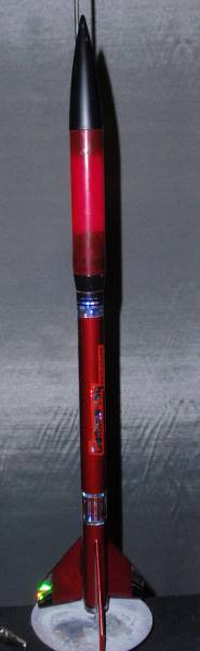I would have to say that finishing this kit was actually easier than most other kits. This was because the texture and finish of the nose cone and transition was good enough to leave natural, so there was less to paint. Even if you do decide to paint them, there is no critical masking to be done as they can be painted seperately from the rest of the rocket. You may want to mask off the plastic transition's lower shoulder though to allow for a good fit with the body tube. Certianly you don't want to paint the clear red payload tube! The rest of the body and the fins was finished with a single color of spray paint. In my case I decided to use metalic red, which goes very well with the metalic silver stickers supplied in the kit. Using extra pieces of the metalic stickers, I created some additional silver details on the body tube above and below the fins, for even more added sparkle. These stickers, though not water-slide decals, have remained tight on the rocket after many flights. The most I ever had to do was dab down an occasional corner with a drop of CA glue when it started peeling up.