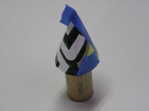Now that the body tube was complete, I moved on to the nose cone. I used a “Vault” 12 pack box to cut out a disk the size I wanted. Then I cut roughly 120 degrees out of the disk. Next, I formed it into a nose cone and glued it together, overlapping it about a ¼inch. I used tape to hold it together until the glue was set. I then used the rest of the old engine casing to form the bottom of the nose cone. The nose cone overhangs the body tube to ensure the end of the tube would not shred during launch. After this was complete I used a 1/8” drill and added a hole to the bottom of the engine casing for shock cord attachment.