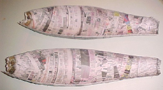 glass1.JPG (56563 bytes)MVC-001F.JPG (52987 bytes)The papier-mâché was covered with a light coating of Vaseline to facilitate removal of the fiberglass. I coated the molds with West Systems epoxy and laid 4 layers of 6 oz glass. Again, the difficult part was the OBT grove. Once dry, I cut the glass so that it was even with the sides of the molds. The glass popped right out, right? OY! Not a chance. A good portion of it did but I ended up soaking them in one of the bathtubs for two days and picking off the news paper! (My wife is still pissed) OK, the paper is off and the two halves are sanded. I expoied them together and glassed them. The glass didn't sit smoothly and evenly in the molds so I had a lot of exterior cosmetic work to do. I sanded and glassed for two weeks!