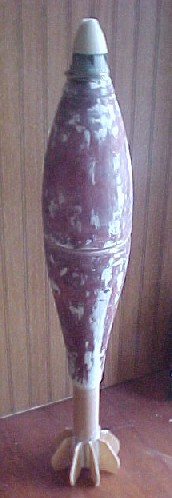 I made a mold from an actual mortar. (No, it wasn't loaded) The one you see pictured is the exact same mortar as the high explosive mortar but is inertly loaded for training purposes and thus painted blue (FRTR). I first covered the mortar assembly with Vaseline then I laid papier-mâché onto a mortar in several layers. The finished thickness was about 1/4 inch. The hardest part was accurately applying the papier-mâché to the obturating grove (OBT groove). (The undercut in the bourlet, just aft of the ojive) I laid thin strips in the grove to bring it to the OD level. After three days of drying time I cut the papier-mâché lengthwise on each side.  It was a little difficult to pry apart but caved in to my prodding in short order.