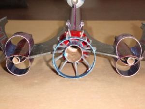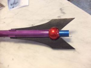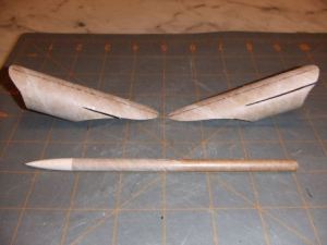 There's still more to build out beyond the pods--each gets a pair of fins mounted into the tube seams, with the fins spread out at about a 70 degree angle (aided by a little cut out angle template). The tip of each of these fins gets a wood dowel gun, trimmed to match the angle of the fins.