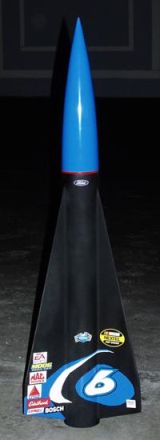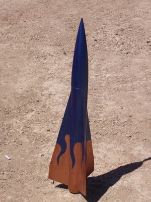 Using a section of body tube and fiberglass, I patched the zippered area and built up the fin tip with Bondo. The rocket got a fresh paint job. Copper with metallic blue flames with red pin striping.