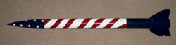 The upper section was next. I masked off the area from the top stripes down, then began working on the stars. I used Paintshop Pro to make the stars, then printed them out on paper. The stars were cut out in paper strips, 8 at a time and placed and scotch taped down over a 1" thick strip of masking tape which was laid on a cutting board. I used a Exacto to cut out each star from the masking tape and placed them in the appropriate positions. 4 coats of Krylon Dark blue were painted over the upper section and nosecone and left to sit overnight. Then I removed the masking tape stars and viewed the final product for finish.