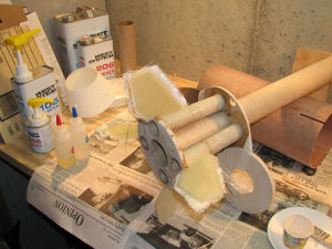 I put adhesive fiberglass tape inside paper shroud and built up to 3-4 layers. I learned this method doing Art Applewhite saucers, just heavier here. I then spread plenty of thick 5 minute epoxy over the tape to harden the transition. The transition was warm to the touch for 10 minutes. The transition came out rock solid, then I used epoxy to fill and attach wrap to transition. Modified assembly process resulted in the transition being slightly large for the wrap.