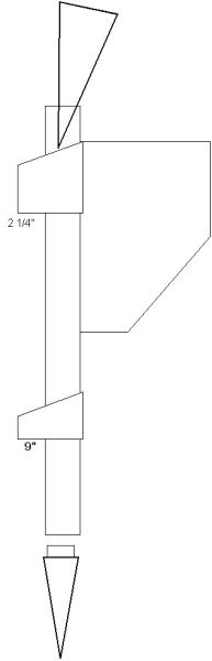 While the version 1.1 was designed for a 3/16” rod, the rocket was too heavy. The version 1.2 was upgraded for ¼” rod. Since all I got was 1/8” launch lug material, I had to improvise. Take 3 of the small skewers, cut 2 to 7” and the third to 9” from the pointed tip. Save the cut off ends for future use. Glue the two 7” skewers to a tongue depressor even with the ends. Let dry. Cut the ¼” dowel into two 6” sections. Glue these to the 7” skewers. Finally, the 9” skewer needs to be glued in the middle of the tongue depressor on the opposite side.