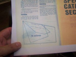 Hoping for the best as far as sizing is concerned, I ran off three copies of the catalog page containing the fin templates on cardstock. I then used an ancient guillotine style paper cutter to cut out one of each of the 3 different fin templates.