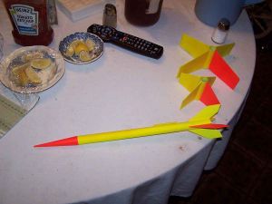 Letting the glue joints on the fins dry and filleting them took some time. I used part of that time to fashion a recovery system. The two boosters are tumble recovery so there was anything to do for them. The sustainer though, was a mystery to me. The original instructions made reference to an "attach kit" which I presume was for recovery. I have no idea what the kit contained. I also don't know whether the kit was supposed to use a parachute or not. What I do know is that I intended to use a streamer. Recovery is going to be problematic enough at my field. Besides, the rocket is very light.