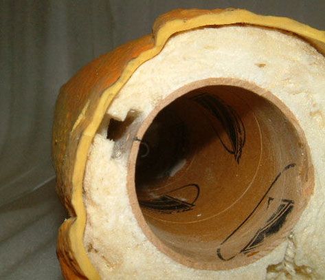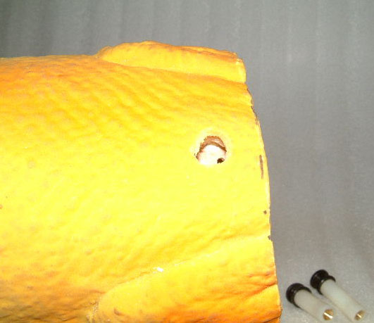 Time to make a quick cut and "off with its head". First cut through where I thought I had to cut and the head refused to budge. A spell head scratching, cursing, asking others for guidance and being told "you didnt want to do it like that" later and an second calculated cut was made. This time the head came off in my hand. Some modification and fettling and I had a useable head / beak / nose cone. The reason for the cut point moving was that the pressure of the expanding foam had forced the inner nose piece back down the inside of the motor mount. The second cut was measured from the position of the aft end of the nose piece relative to the back end of the motor tube. With the length of the coupler used for the nose piece know it was possible to work out where the front of it should be. Measure along the outside of the chicken and cut through.