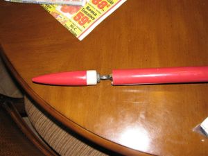 First the motor mount build. I used Probond wood glue. Then I marked the body tube for four fins. Next, I cut out my upper and lower fins since I was upscaling I had to kind of add a little bit here and there to make it look OK. I rounded all my leading edges. Then I cut my pylons for my tube fins. Basically I just took a 1-inch wide piece of 3/32-inch basswood and cut a angle at both ends to keep things simple. I attached the upper and lower fins starting at the tail end of the body tube. I attached the pylons 2 inches from the back of the body tube. Now it was time to fix the nose cone and add nose weight. I just drilled out the center of the weight for the screw eye, which is about a 1/4 inch in diameter. Next, I inserted the screw eye through the weight, put a little glue on it, and screwed into the nose cone. I attached the shock through the body just above the motor mount by using a X-Acto knife to bore me a little hole large enough for the cord then put a knot at the end with a little glue to attach nylon cord to other end to nose cone. For the tube fins, I drew a line top to bottom on both tubes, put a little glue on the mark and the pylon, let it set for about 5 or 6 minutes, and then attach the tubes, let them dry then fillet everything. I coated all my wood area with wood glue for strength followed by a great wood filler, then sanded and painted.
