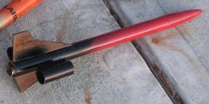 This is a single stage rocket with two outer tube-fins attached via pylons.There are two standard fins to give it a
