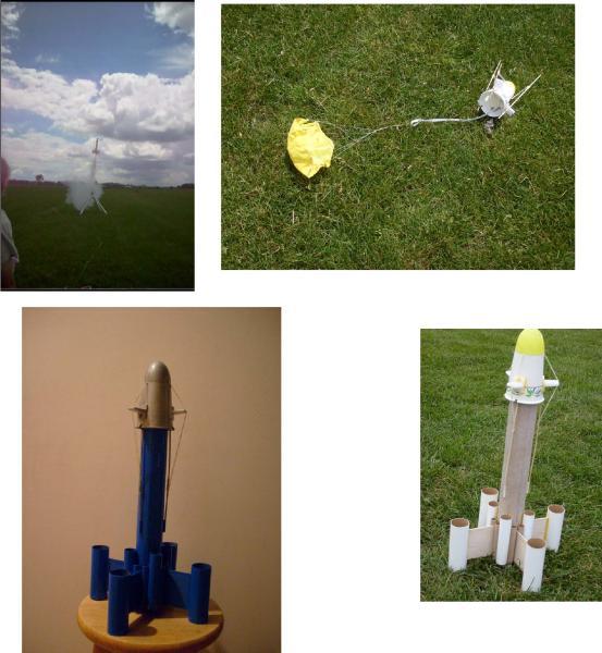 Cut a slit in the side of the cup to accomodate the launch rod. Add noseweight if needed and tape the easter egg half to the bottom rim of the cup. The shroud lines on the yellow parachute are doubled, so cut off one from each point on the chute and put them on the silver chute using scotch tape. Attach the shroud lines packaged with the orange chute with tape. Attach the silver parachute and the orange and white parachute to the shock cord on the booster. I also used string from my box to separate the two. Attach the yellow chute to the shock cord on the lander. Add masking tape (or scotch tape) above the rubber bands to prevent sliding. You are now ready to fly!