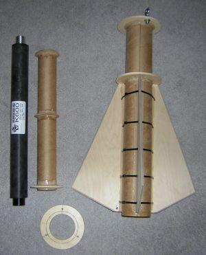 LOC/Precision Big Nuke 3E I also built a motor mount adapter from a 17" section of LOC/Precision 54mm motor mount tubing, 2 LOC CR-3.00-2.14 centering rings and 1 LOC CR-3.9-2.14 centering ring for a back plate. The 54mm motor I had planned to use would be longer than the motor mount tube and could be retained from the top and bottom with masking tape since the adapter is removable. Three blind nuts were installed into the rear centering ring prior to kit construction and fender washers, screws and nuts used for standoffs retain the rear CR-3.9-2.14 centering ring of the motor mount adapter against the aft centering ring of the rocket.