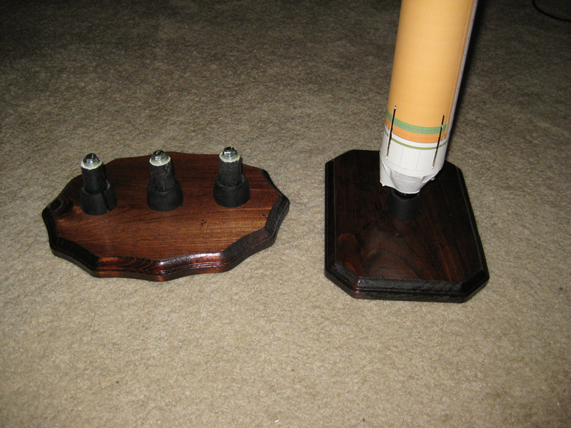 The bases of the stands are wood, with routed decorative edges, and have been stained. The mounts, which your rocket's motor mount slides onto, are 2.25 inches long. The bottom inch of the mount is surrounded with an angled circular piece which mimicks the Delta IVs bell engine nozzle(s). A gap exists between the stands nozzle and mount, so that the motor mount of the rocket can slide down the full 2.25" length of the display stand mount. There is a slit running down the length of the engine nozzle portion of the stand to accommodate the motor clip of the rocket.