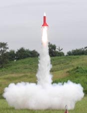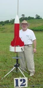 Sprite launch It was now time to attach the fin ring and fin caps. Careful attention was paid to the alignment of the caps so that minimal filling of gaps was necessary. When the assembly was completely dried, I once again used the epoxy/micro-balloon mixture to create fillets both inside and outside the fin ring at each fin and fin cap. I used grain filler on the plywood fins, and after some extensive sanding, was finally ready to prime the entire rocket. More sanding, filling and priming followed, of course, until I was ready to paint. After adding an 18-foot, 5/8-inch tubular nylon shock cord and a Sky-Angle 52-inch parachute with Nomex protector, the total weight without motor is just over 8-pounds.