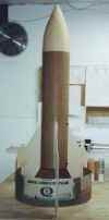 My son, Chris, almost immediately began urging me to build another one. Due to the amount of work that was involved in the project, I was unwilling to commit to such an ambitious undertaking. Over the Sprite parts layout next twelve months or so, I did acquire a piece of 15-inch diameter cardboard drum, which would make a fine fin ring, (my first one was 11.5-inch diameter) and a 24-inch long section of 5.5-inch airframe. This would amount to a 7.3X version of the original Estes model. I also purchased a 3 x 6 x 36-inch block of balsa wood, that I planned on using to turn a scale nosecone. I cut the block in two and laminated them together to make a nice 6 x 6 x 18-inch blank, and then set it aside, where it would sit for almost another year. One weekend in February of 2001, I was turning a couple wooden nosecone patternsSprite nosecone for a Tripoli Pittsburgh group project, the Gloria Mundi III. After completing this task, I decided to go ahead, and turn the new Sprite nosecone from the balsa block that had been collecting dust. After finishing the outside form, it was necessary to hollow out a large section of the cone so that I would be able to add the one-pound of weight needed for stability. I cut a bulkhead from .5-inch plywood to seal the opening that was epoxied into place after filling the cone with expanding foam. Before I knew it, the nosecone was complete, and I was planning my next steps of the project, that would soon come to be known as "The Lord of the Rings."