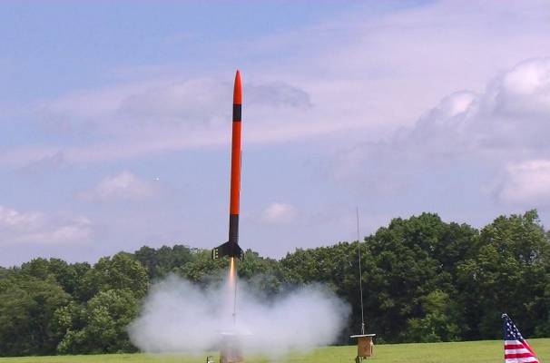 The Renegade: It is a very old model built in the 1970s by my brother. The Renegade is a classic '70s kit. Not at all like the modern Renegade; this is your father's Renegade. This is a large, tall, D-powered model, finished in the original catalog paint scheme. Build credits for this kit actually go to my brother. I modified it by adding my usual altimeter payload bay ("Iris"). This adds 4-1/2 inches to the rocket's length and 17 grams of nose-weight. I also replaced the Estes plastic parachute with a better nylon cloth parachute, and use a Nomex cloth instead of wadding. After an Iris test flight with a D12-5, I’m going to load this baby up with a Aerotech E20-7W engine and push the boundaries of rocket power (for me, anyways). This model reaches about 500' on a D12-5, but on an E20, I would expect at least 1000'. (Iris is named after the Greek god of the rainbow. She is a messenger of the gods, linking the gods with humanity.) This rocket has flown higher than William Penn on top of the Philadelphia City Hall building, NASA's VAB building at Cape Kennedy, or the Cologne Cathedral in Germany.
